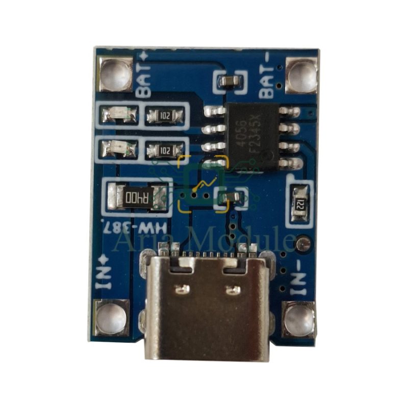 شارژر باتری لیتیوم TP4056 1A ماژول Type-C، با قابلیت شارژ سریع و امن، مناسب برای باتری های لیتیوم پلایشی با جریان 1 آمپر، دارای ورودی Type-C و حفاظت از اضافه بار و اتصال معکوس.
