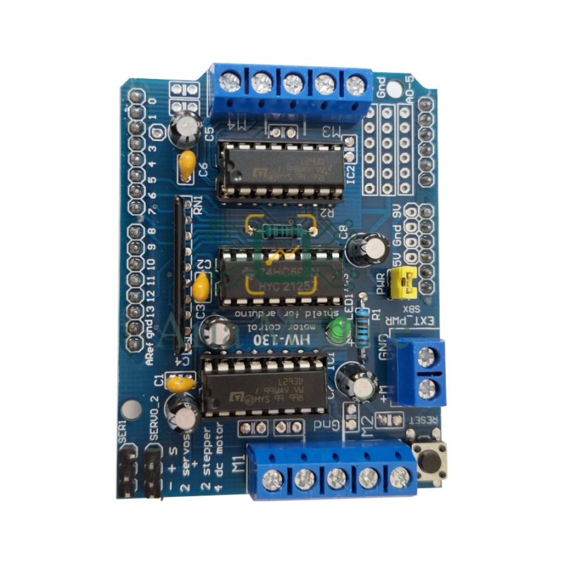 شیلد و ماژول درایور موتور L293D: این ماژول به صورت خاص برای کنترل موتورها طراحی شده است و قادر است تا دو موتور DC یا یک موتور پله ای را با ولتاژ کاری ۴.۵ تا ۲۶ ولت کنترل کند. L293D دارای پین های ورودی برای دریافت سیگنال کنترل و پین های خروجی برای اتصال به موتورها می باشد و همچنین حفاظت از مدار در برابر جریان های بیش از حد را فراهم می آورد.
